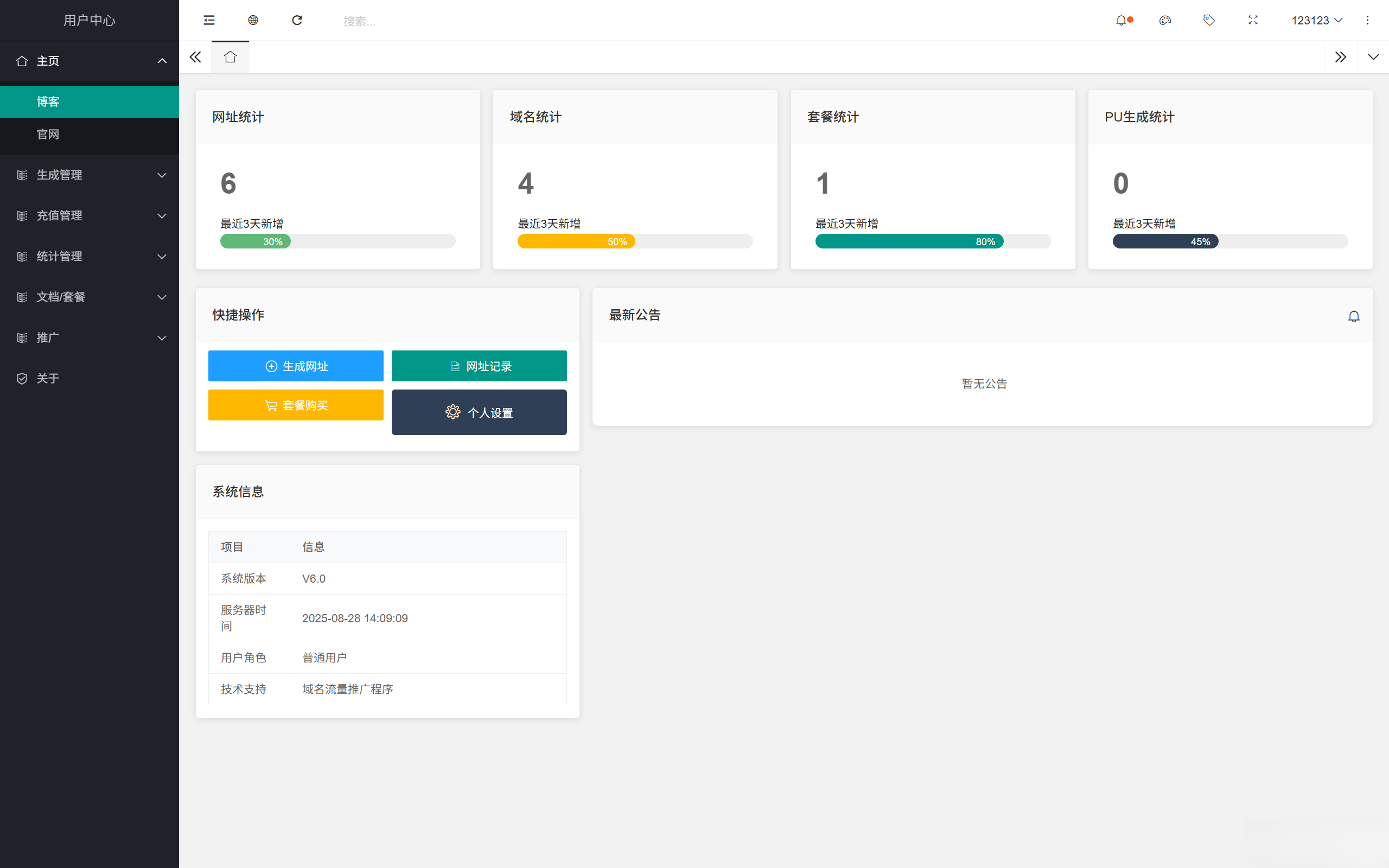 用户端-> 业务处理:网址生成[单次/批量生成,可选域名池,短网址,库Ua等自定义选择]数据化管理,统计每个生成的访问次数 ————————————– 支付充值:余额在线充值制[支付宝,微信,QQ,USDT等多种支付方式] ————————————– 订单数据:数据列表化,清楚支付时间与地址 ————————————– 文档详情:提供详情参数,请求地址,可POST/GET请求数据,返回数据等,以及具体参数内容讲解与示范,Java/Python/Php/Curl等参考示例代码 ————————————– 流量推广:[百度/必应/360/搜狗/夸克/神马等搜索引擎],实时具体推广推送网址,输入即推送,提高网站排名数据 ————————————– 统计数据:可任意查看生成网址具体访问信息地址ip等内容