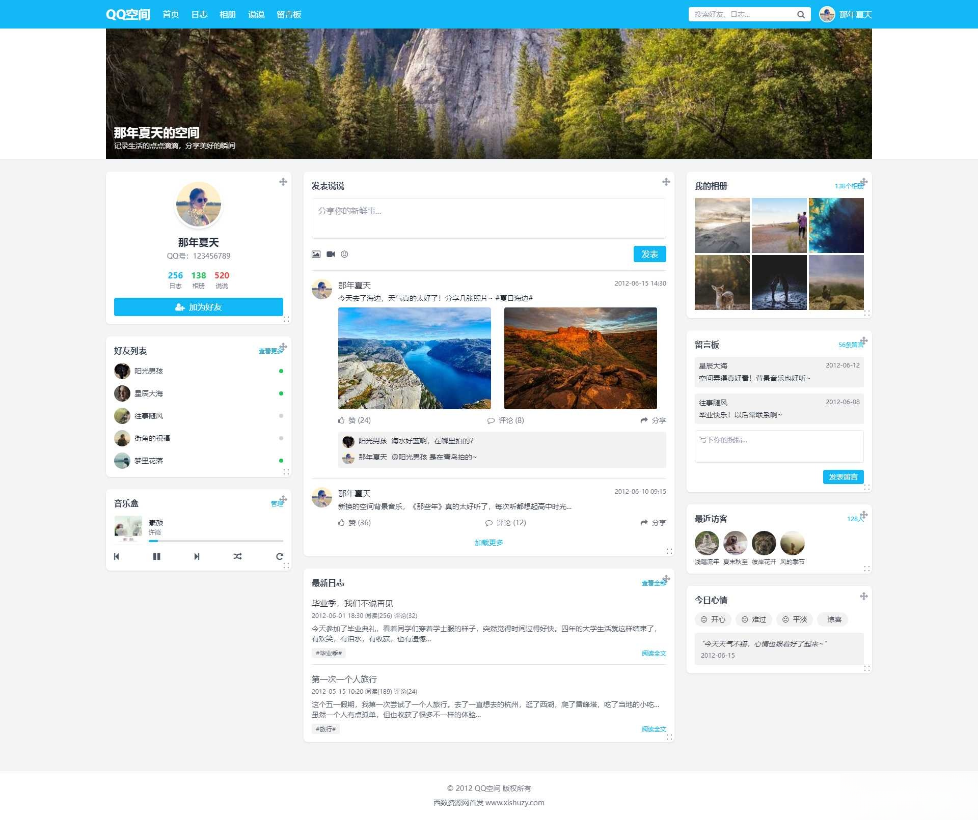 这个 QQ 空间的页面实现了以下特点: 经典布局还原:采用了当年 QQ 空间标志性的三栏布局,顶部有蓝色导航栏和横幅区域,中间是内容区,底部有版权信息。 可拖拽 DIY 模块:所有内容模块(个人资料、好友列表、音乐盒等)都支持拖拽功能,用户可以根据喜好调整位置,模拟当年的 DIY 体验。 功能完整的音乐播放器:包含播放 / 暂停、上一首 / 下一首、随机播放、循环播放等功能,并能自动播放音乐,进度条会随音乐播放自动更新。 时代感内容:页面中的说说、日志、相册等内容都围绕 2012 年左右的流行元素和表达方式,如 “那年夏天”、”毕业季” 等主题,唤起用户的回忆。 响应式设计:页面在不同屏幕尺寸下都能良好显示,兼顾了现代设备的浏览体验。 您可以直接使用这段代码,它已经可以正常运行,重现当年 QQ 空间 6.0 的经典体验。