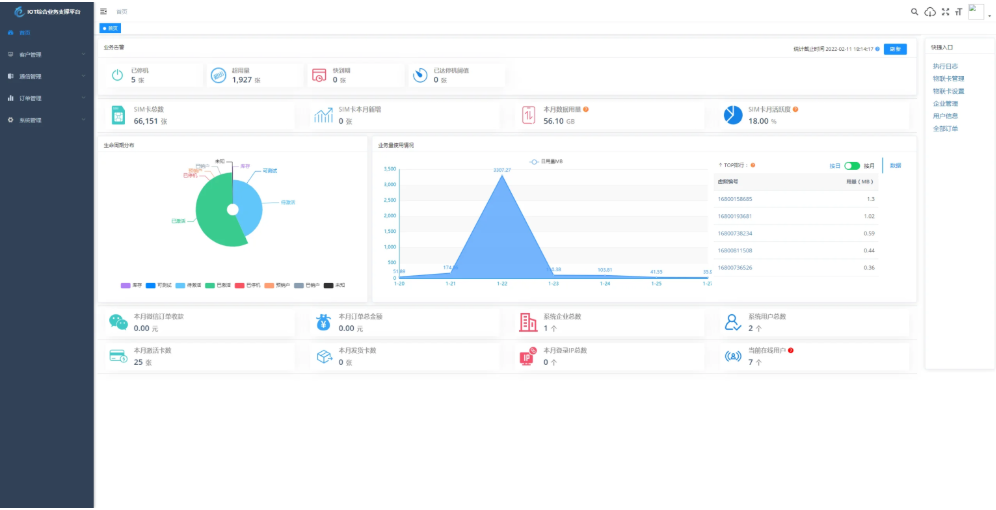 管理物联卡 用量记录、套餐封装、在线信息获取、智能诊断、分组备注、企业代理管理、预存、充值、返利 等。